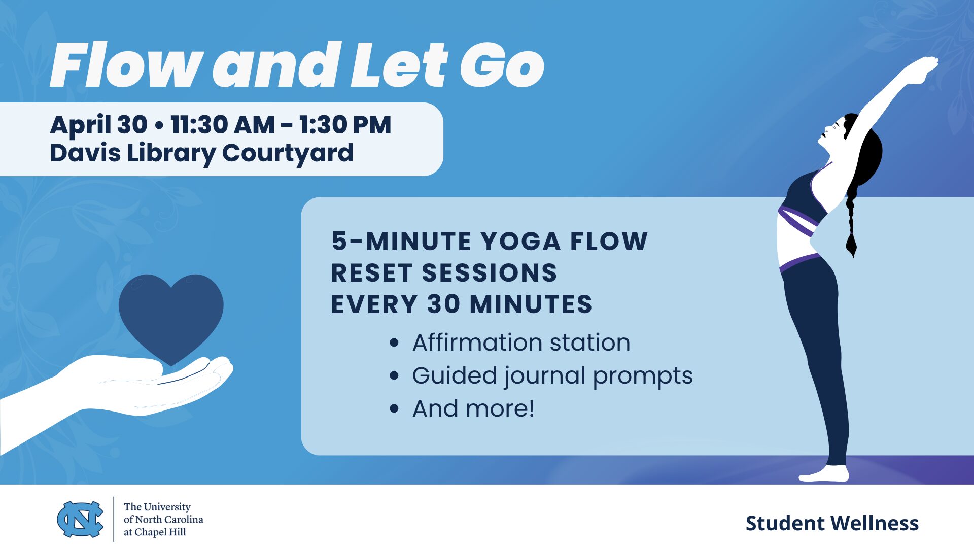 Stop by the Davis Library Courtyard on April 30 from 11:30 a.m. to 1:30 p.m. to enjoy a quick yoga flow, affirmation station, and guided journal prompts.